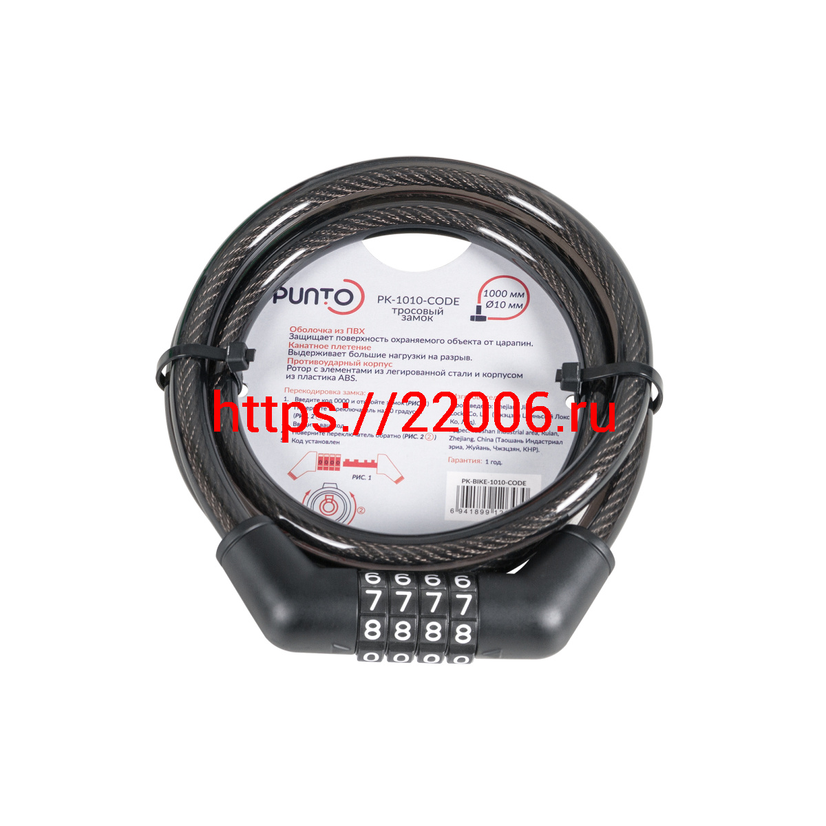 - Замок Punto (Пунто) тросовый PK-BIKE-1010-CODE (10х1000) /подвес в Туринске недорого