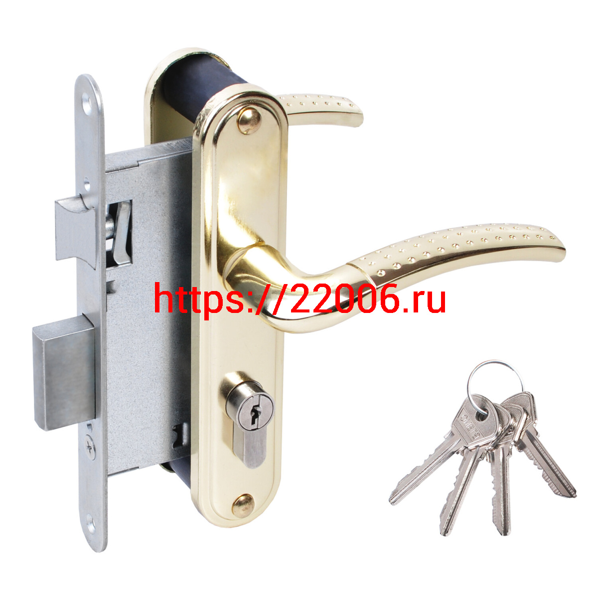 - Замок Omega (Омега) врезной цилиндровый с защёлкой в комплекте с ручкой ЗВ4-55.27 (золото-лак), 4 кл. в Туринске недорого