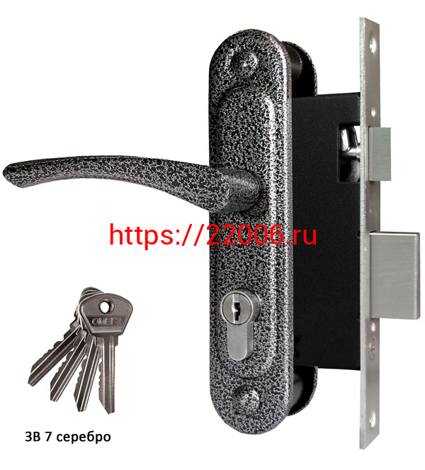 - Замок Omega (Омега) врезной цилиндровый с защёлкой в комплекте с ручкой ЗВ7 (серебро), 4 кл. в Туринске недорого