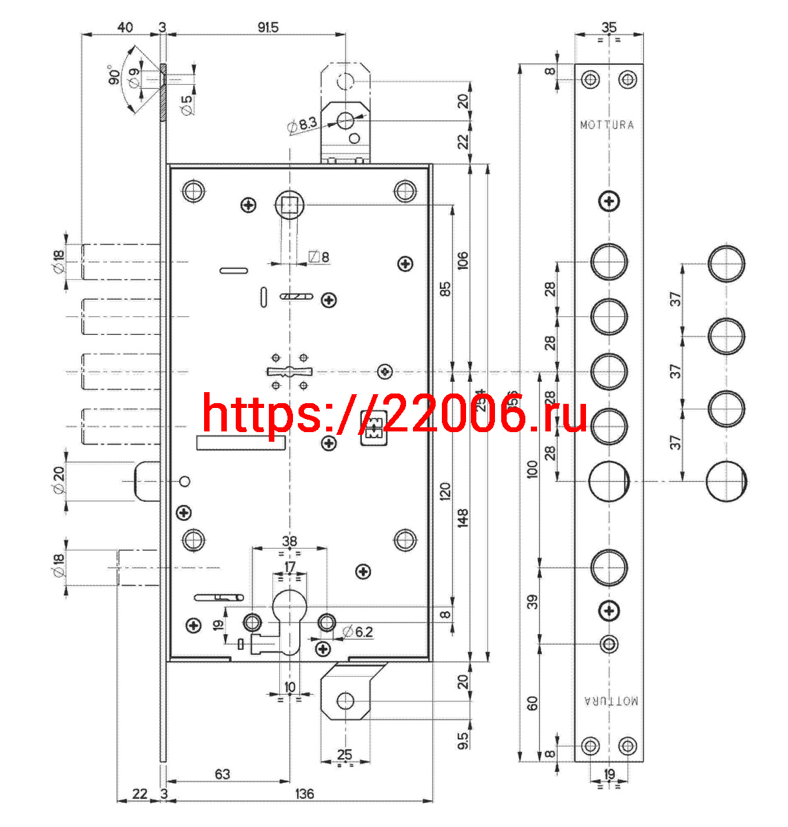 - Замок Mottura (Моттура) врезной двухсистемный 54.797-S (левый) (без накладок), ключ 60 мм в Туринске недорого